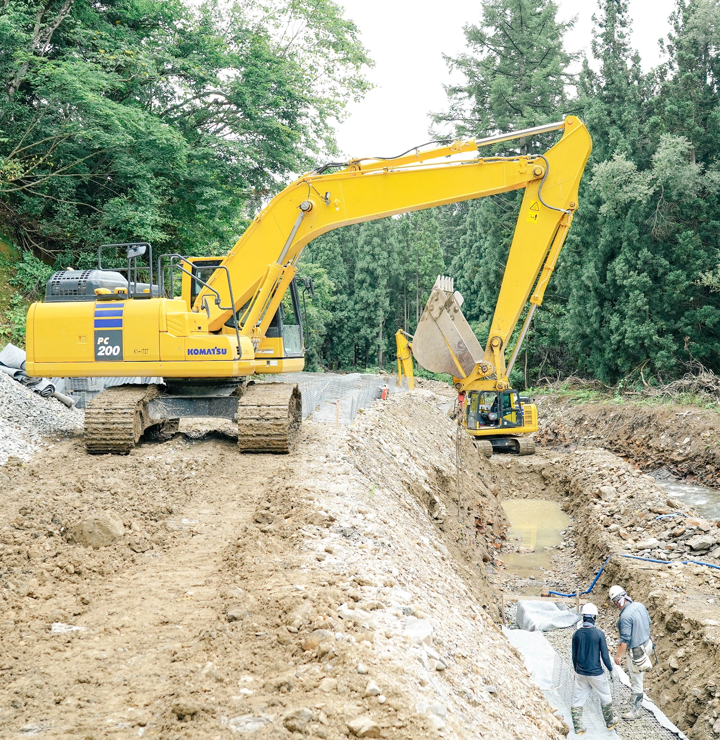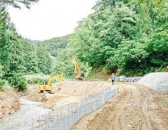 当社は地域の安全と暮らしを守るため、護岸工事・災害復旧工事・水路工事・解体工事などを幅広く手がけています。